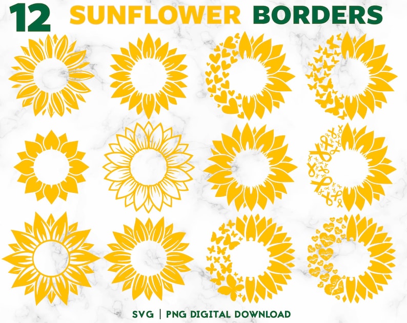 Make your projects shine with 12 Sunflower Svg! Our digital download design is the perfect way to create stunning visuals for any project. Our 12 Sunflower Svg is perfect for t-shirt design, scrapbooking, photo albums, card making, coffee mug designs, prints, and anything you want to cut with your Cricut and Silhouette. We offers the perfect high-resolution artwork for all your creative needs. With a few simple clicks, you can easily bring life to any project with our beautiful designs. Download now and get creating!